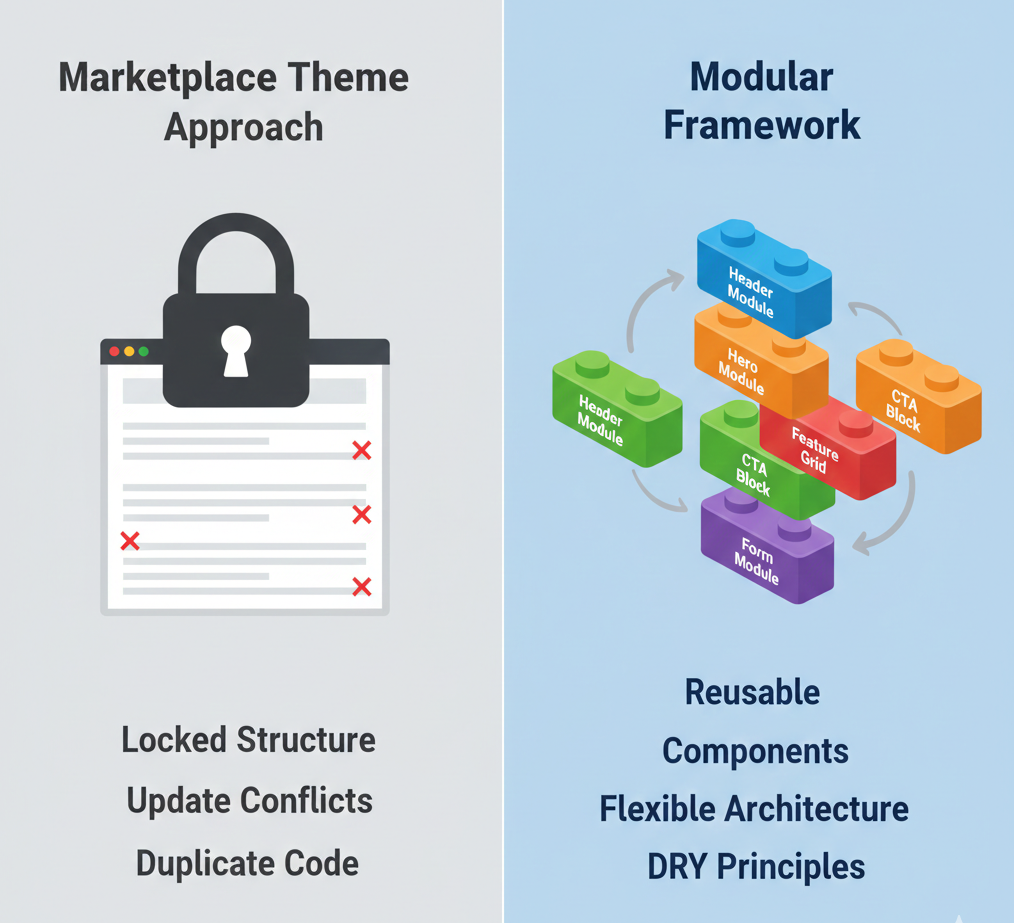 Hard-coded templates embed content directly into HTML structure. Each page variation requires duplicate code. Updates cascade into painful find-and-replace operations across multiple files. This approach—common among developers transitioning from traditional web development—creates maintenance nightmares and destroys marketing agility.