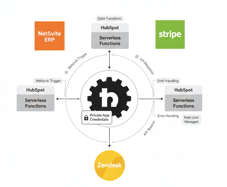 HubSpot serverless functions execute Node.js code in HubSpot’s infrastructure, enabling custom business logic without maintaining separate servers. This middleware layer handles: